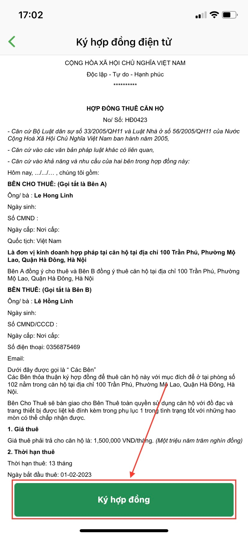 Sau khi đã đồng ý và thống nhất các điều khoản bạn hãy ấn nút Ký hợp đồng để ký hợp đồng online trên phần mềm