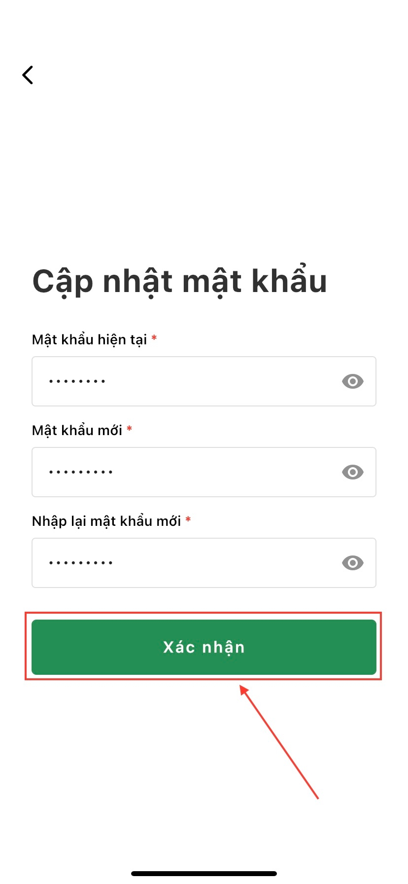 Bước 3: Điền đầy đủ thông tin vào 3 mục: Mật khẩu hiện tại, Mật khẩu mới, Nhập lại mật khẩu mới => Ấn nút Xác nhận