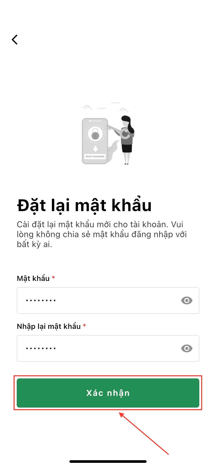 Bước 5: Nhập mật khẩu mới vào ô trống và ấn nút Xác nhận