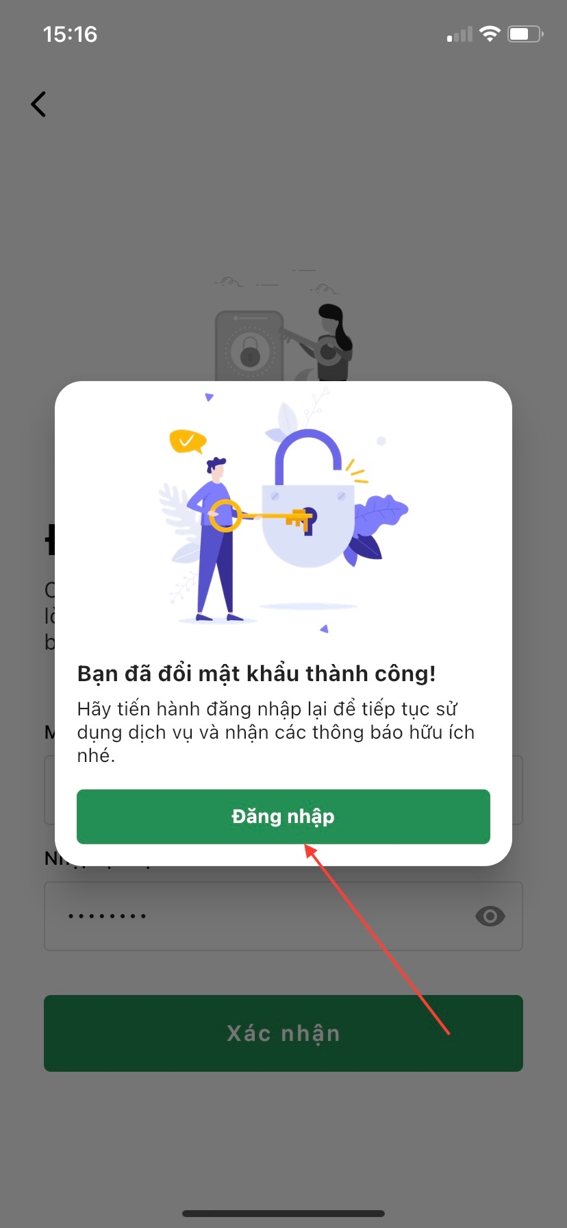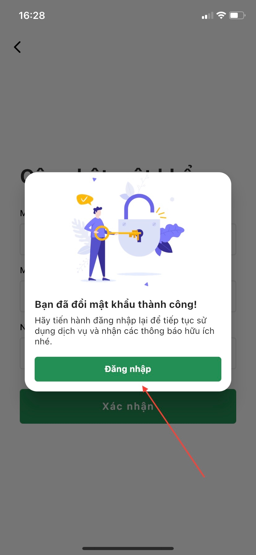 Nếu bạn cập nhật mật khẩu thành công hệ thống sẽ bắn thông báo "Bạn đã đổi mật khẩu thành công". Lúc này bạn có thể ấn vào nút Đăng nhập để đăng nhập vào tài khoản ngay