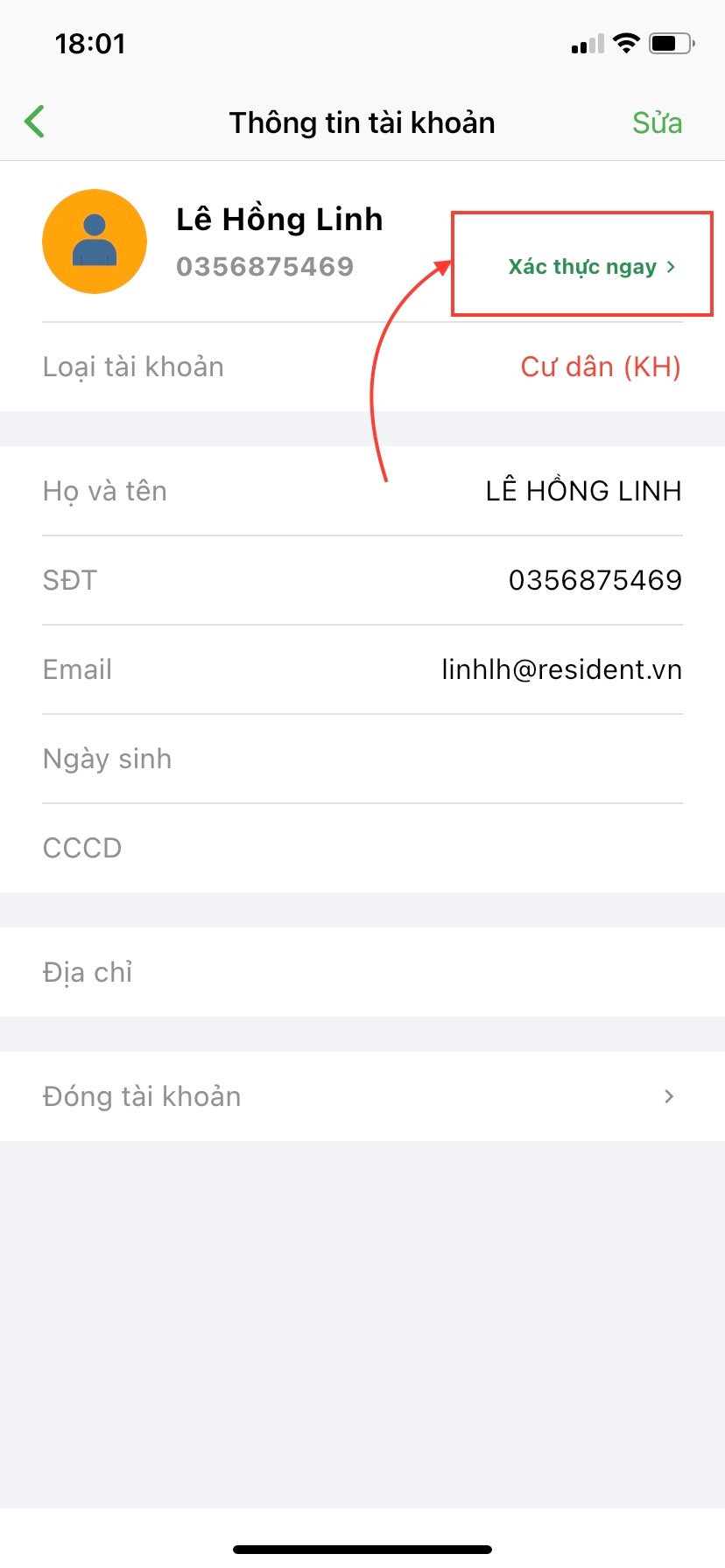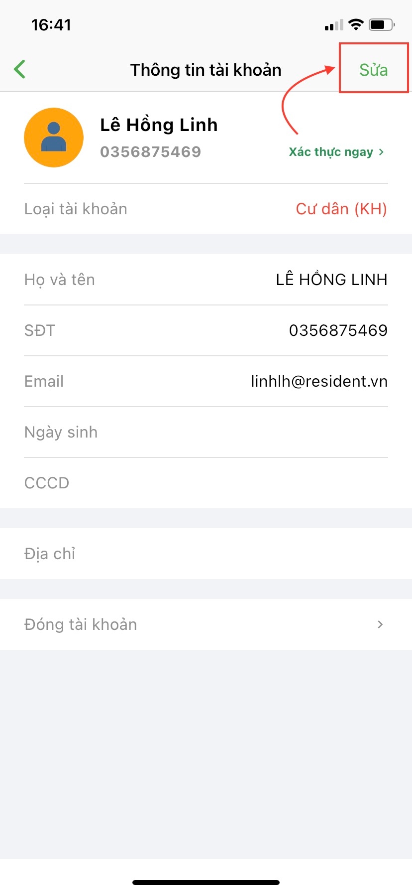 Bước 3: Tại đây, hệ thống đã phân loại tài khoản bạn đăng nhập là tài khoản dành cho Cư dân (KH). Lúc này hãy cập nhật thêm các thông tin khác bằng cách ấn nút Sửa.