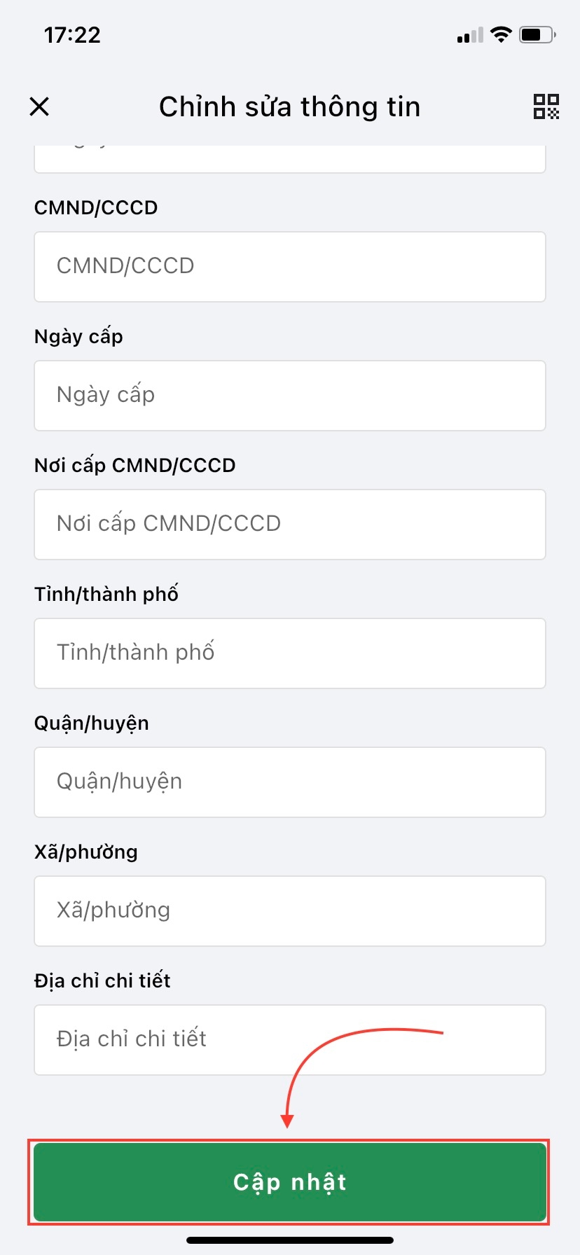 Bước 4: Điền các thông tin còn thiếu theo yêu cầu từ hệ thống và ấn nút Cập nhật.